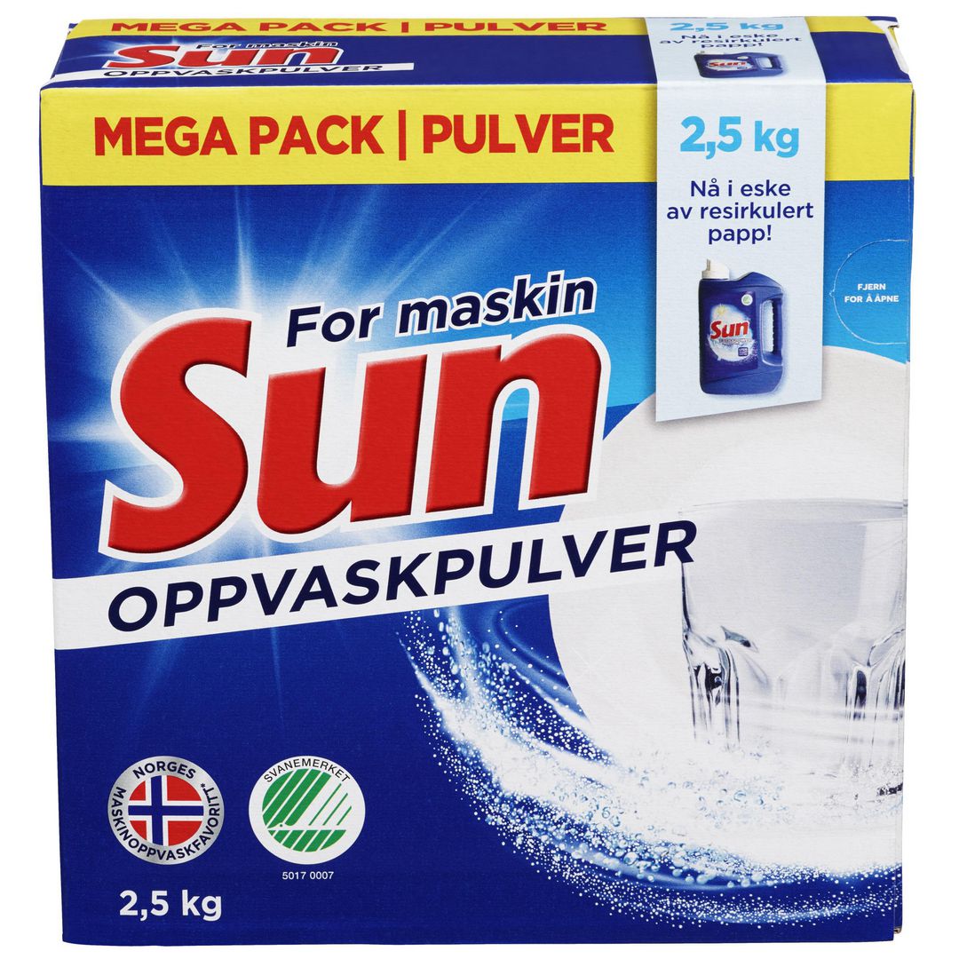 Sun Maskinoppvaskpulver med ny formulering og i en plasseffektiv 2,5 kg eske for ekstra mange runder i oppvaskmaskinen.